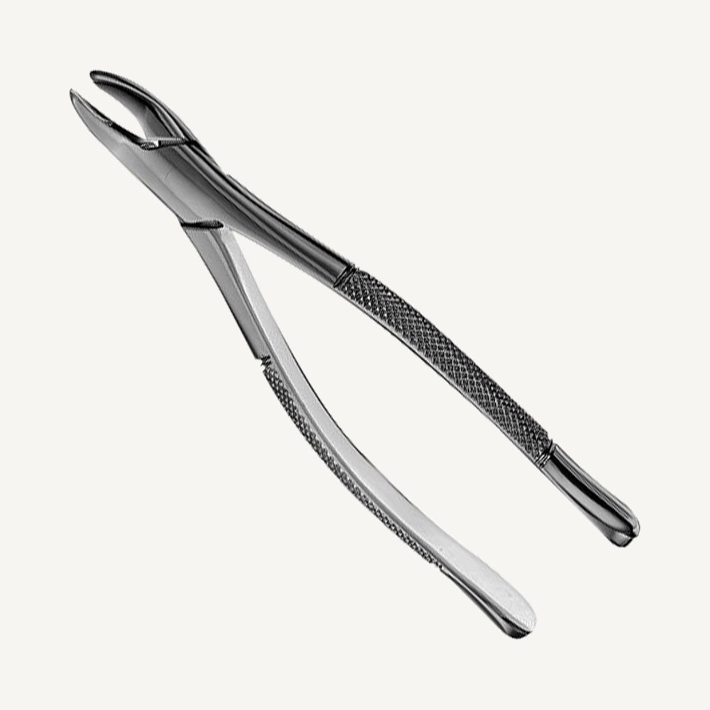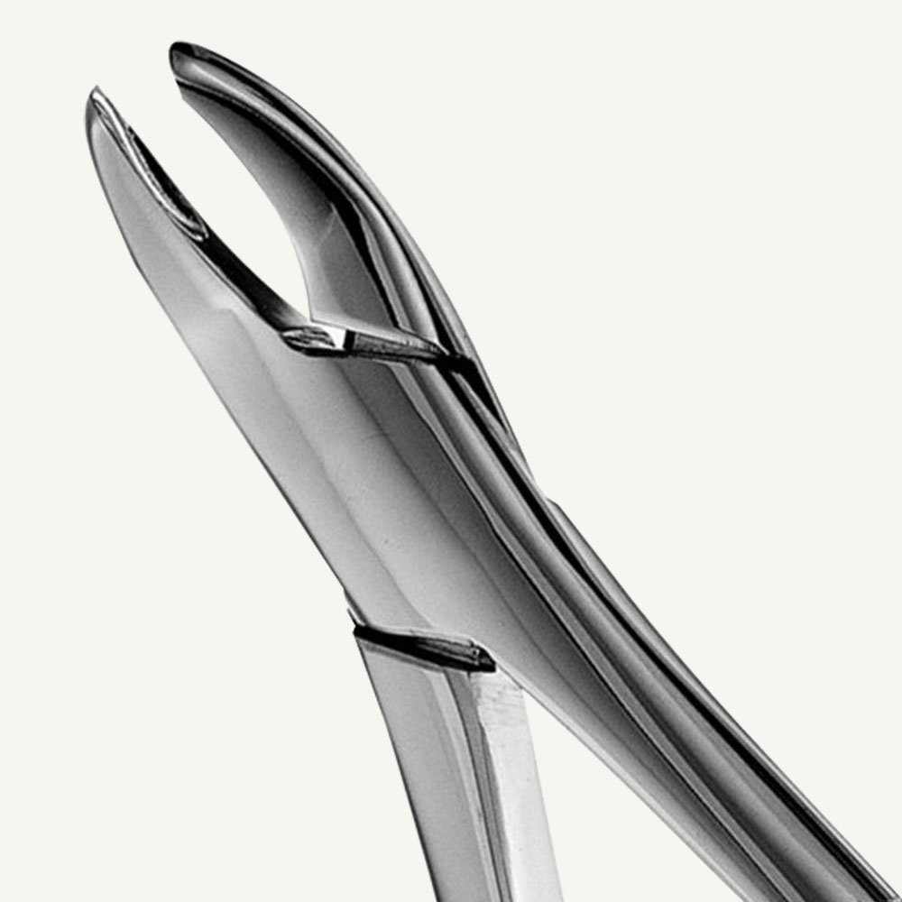 American Pattern Extraction Forceps are made from stainless steel. Forceps are meticulously hand crafted and finished with a scissors hinge to equally distribute forces, and allow easier cleaning and overall maintenance. These forceps are electropolished to a “mirror finish” for maximum corrosion resistance. The beaks of American Pattern Extraction Forceps are designed anatomically to adapt to the tooth at or below the cervical line. Many beaks are serrated, that improves the grasp during extractions.