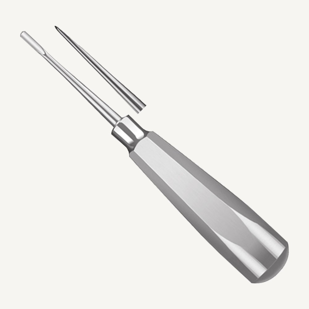 Apexo Elevator is a dental instrument primarily used to remove fractured root tips or fragments deeply embedded in the socket, particularly in the lower jaw molars. Size: 3.5mm x 90mm