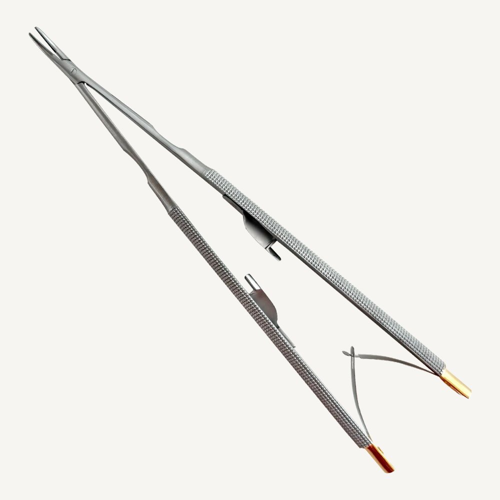 Featuring a curved (CVD) jaw design, it enables accurate alignment and needle guidance in narrow or straight-line anatomical regions. The Tungsten Carbide (TC) inserts in the jaws significantly enhance grip strength and longevity, providing exceptional control over the needle while preventing slippage, even during the most meticulous suturing.