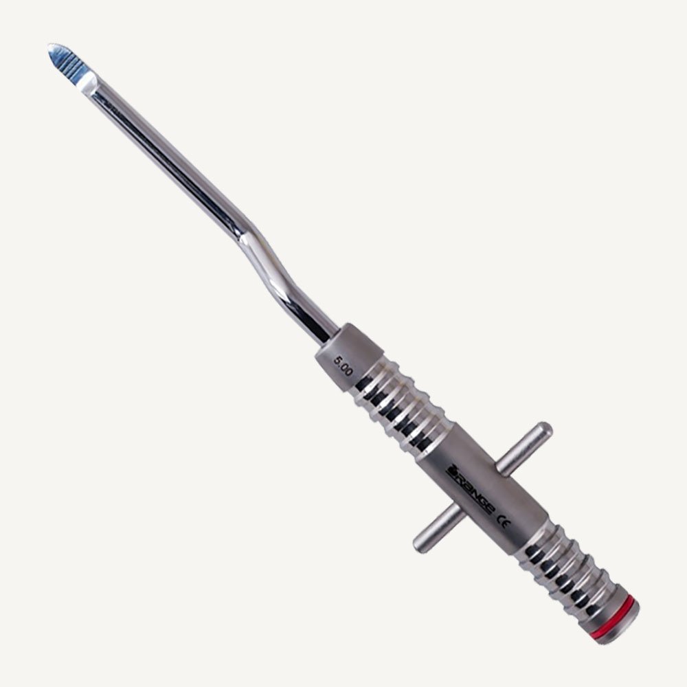 5mm wide bayonet style bone spreader made of stainless steel with depth marking and offset T-Bar Handle which is used for preparing bone.