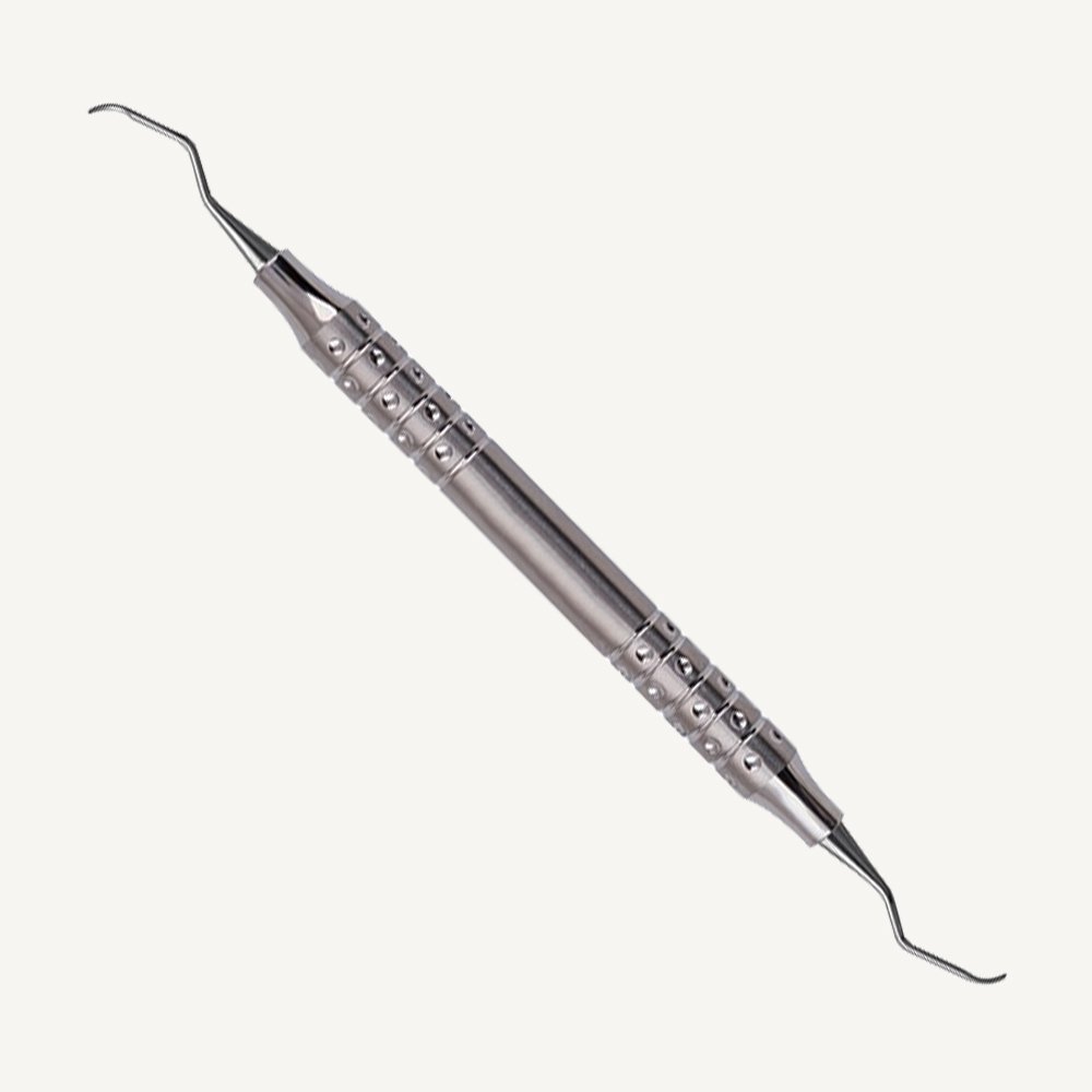 Anterior Columbia Curette 2R/2L designed with 2 cutting edges and a rounded toe which is used on all surfaces.