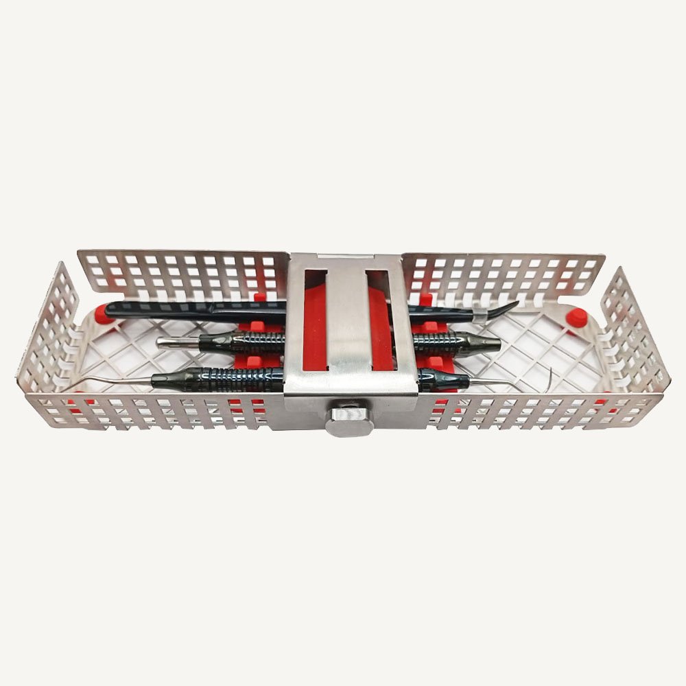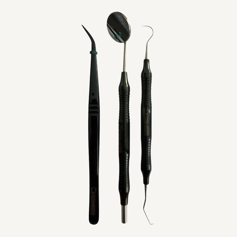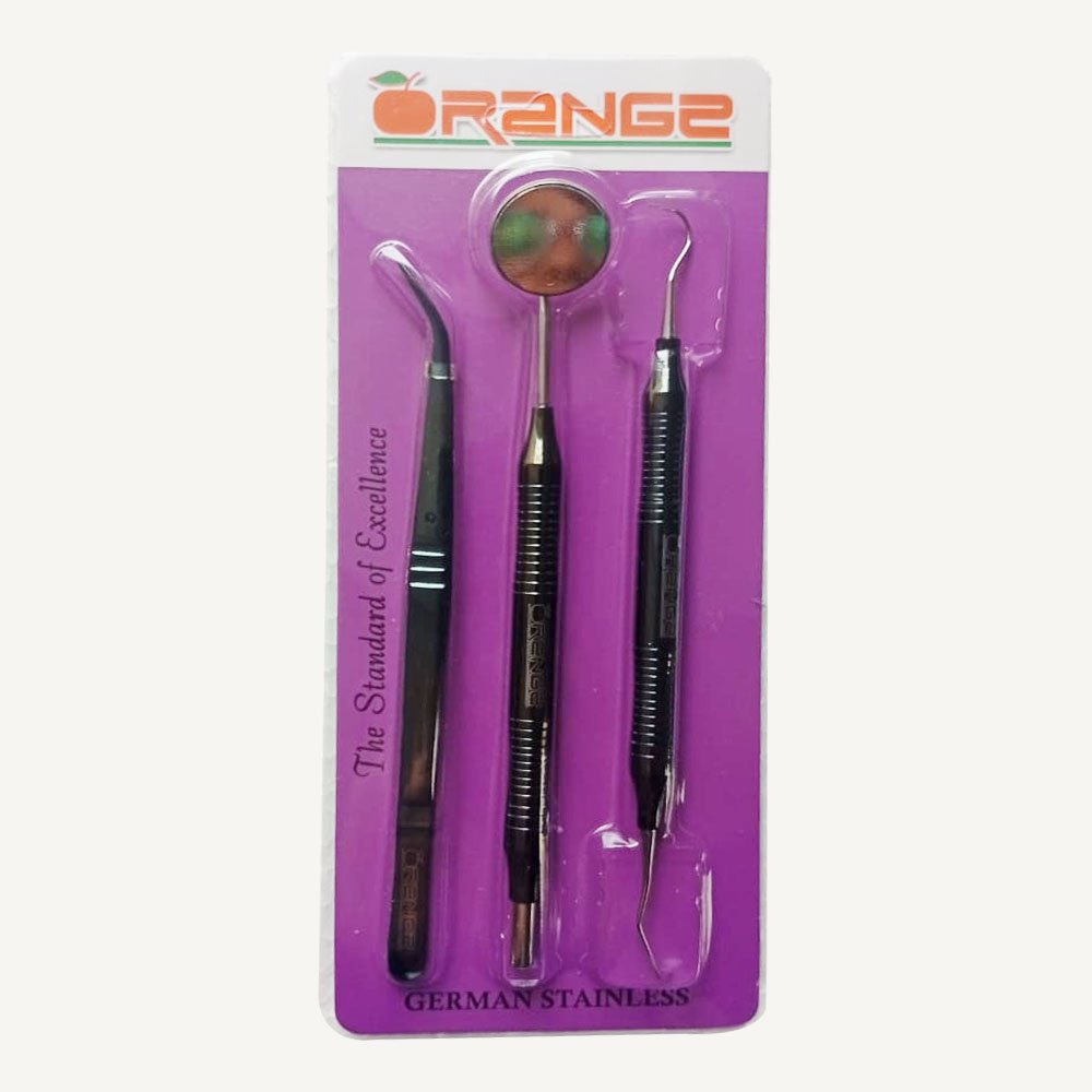 Dental Examination Set comprises of mouth mirror, explorer, and tweezer. The mirror handle and explorer have 8mm hollow handles.