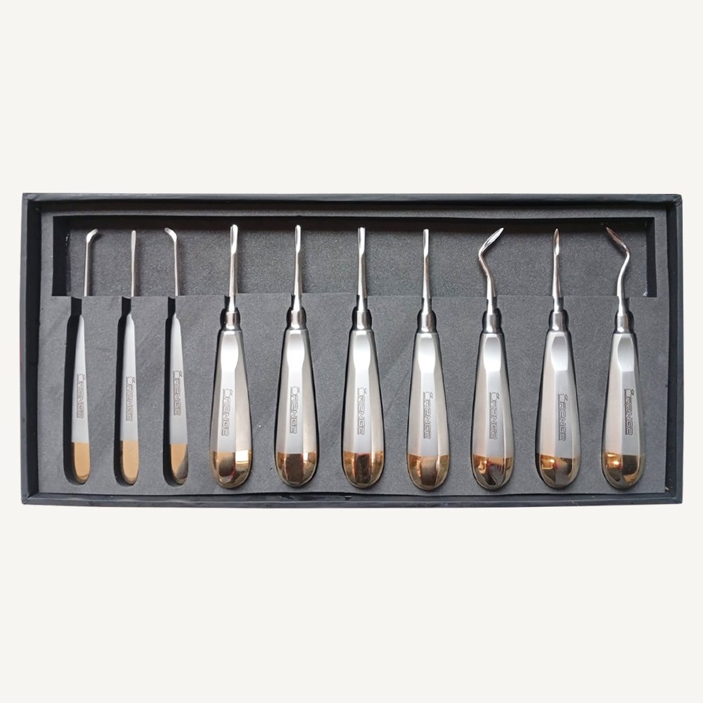 Set of 10 elevators with thumb-style handle. The thumb-style handle of these elevators allows for a comfortable grip and enhanced instrument control during use.