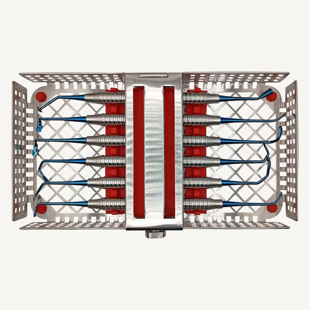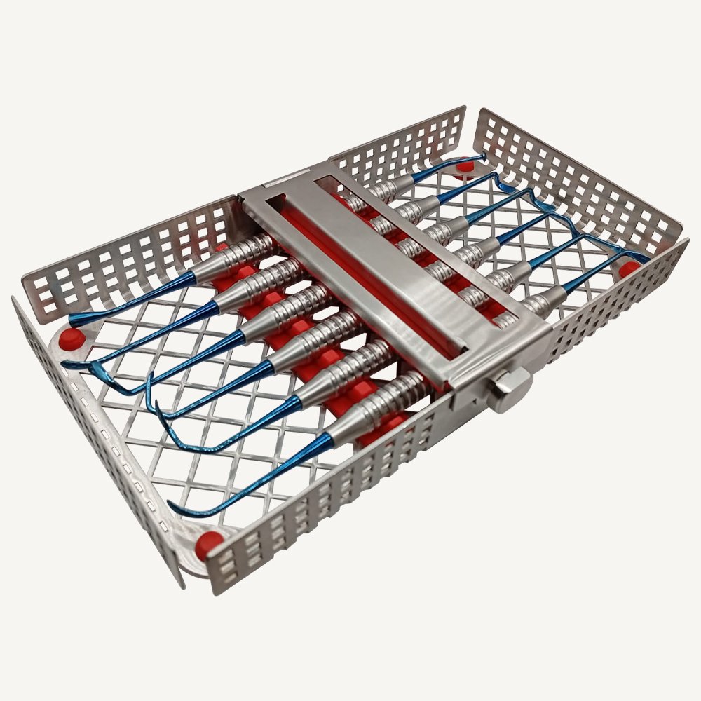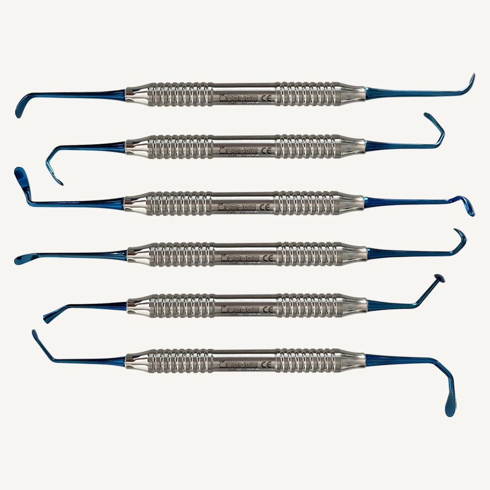 Each instrument in this advanced kit is coated with blue titanium, offering several clinical benefits. The coating provides enhanced corrosion resistance, reduced light reflection, and increased surface hardness, making the tools more durable and comfortable to use during long procedures. The vibrant blue finish also improves visibility, helping clinicians distinguish instruments more easily in sterile setups.