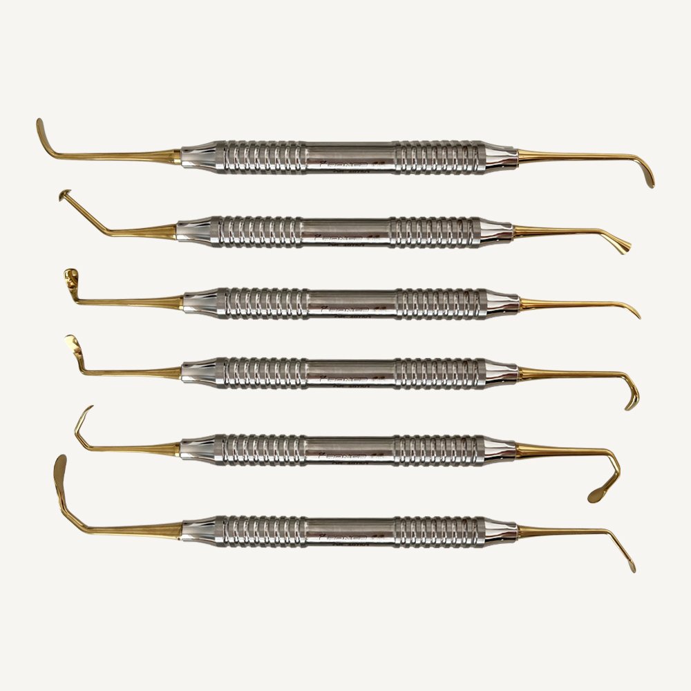 Each instrument in this advanced kit is coated with gold titanium, offering several clinical benefits. The coating provides enhanced corrosion resistance, reduced light reflection, and increased surface hardness, making the tools more durable and comfortable to use during long procedures. The vibrant blue finish also improves visibility, helping clinicians distinguish instruments more easily in sterile setups.