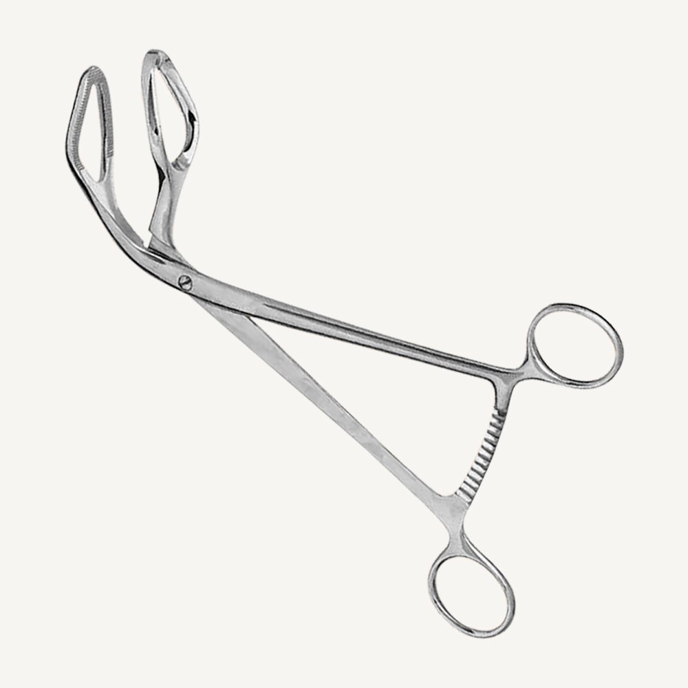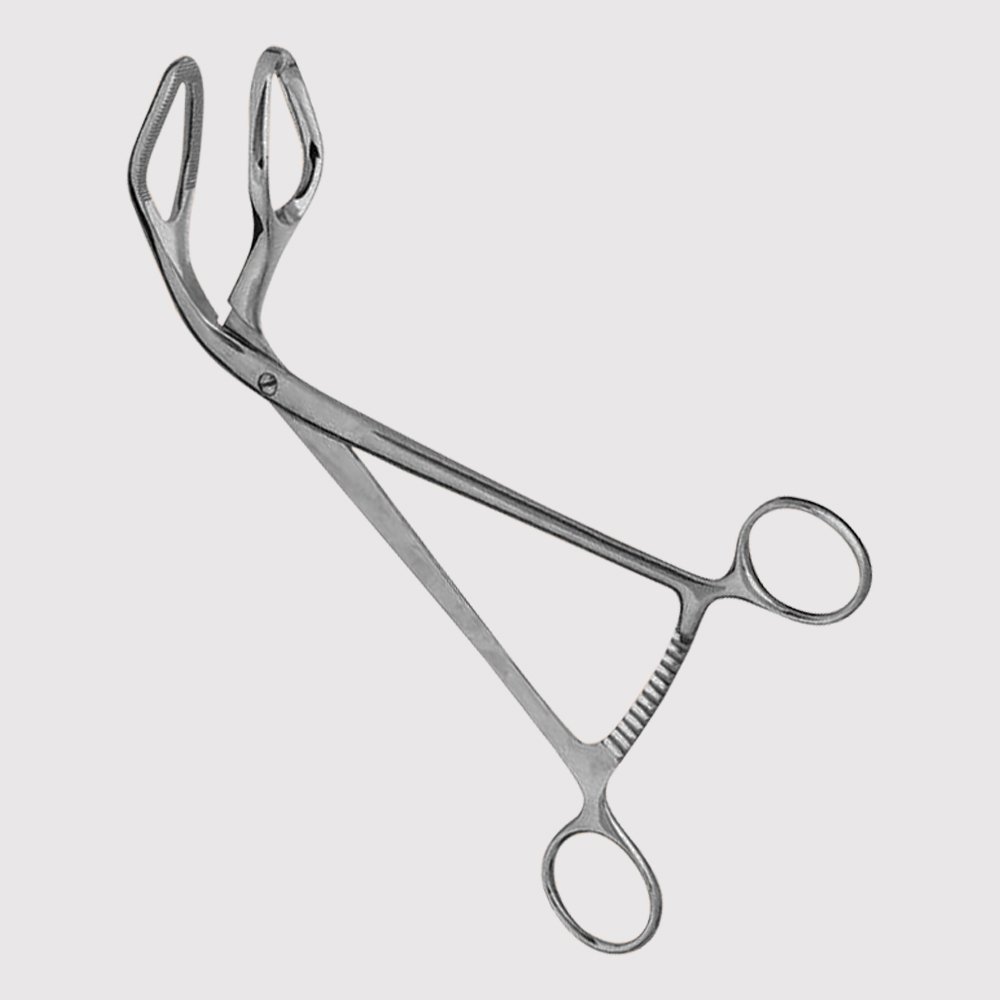 Somers Uterine Elevating Forceps: Mirror Finish, Curved, Serrated, Fenestrated Jaws. Size: Overall Length 8-3/4 inches (22.2cm).
