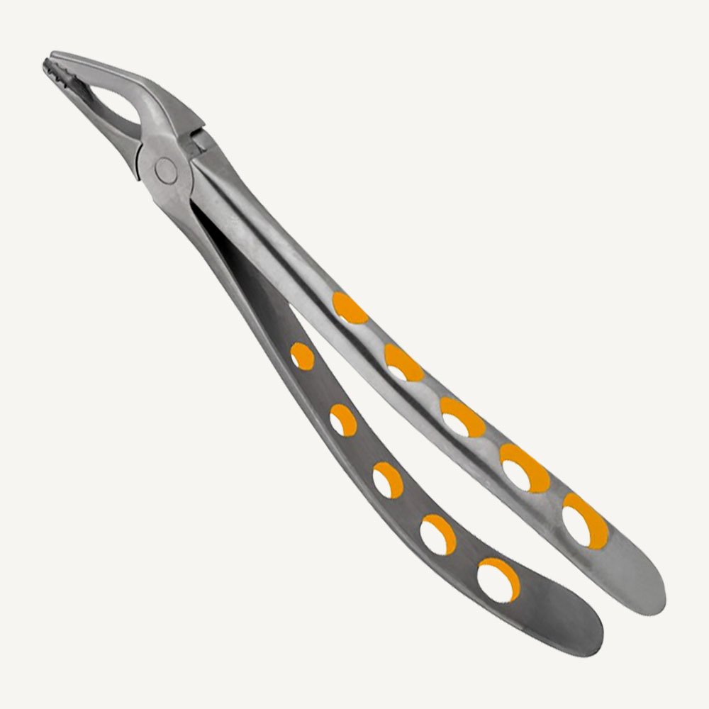 The eXcel ™ extracting forceps designed to permit subgingival access to the root while removing a tooth. The beaks are anatomically shaped, tapered, notched and serrated to permit the forceps to maximize the tooth-to-forceps contact and to penetrate deeper into the tooth socket. The notched beaks provide an enhanced grip which assists extractions and over come the risk of fracturing the root structure or reduce the risk of causing trauma to the surrounding soft and hard tissues. These forceps have unique, light weight and ergonomic handle with smooth matte finish and circular openings which reduce the instrument’s weight. These forceps are made with high quality German stainless steel and provides long instrument life with minimal wear.