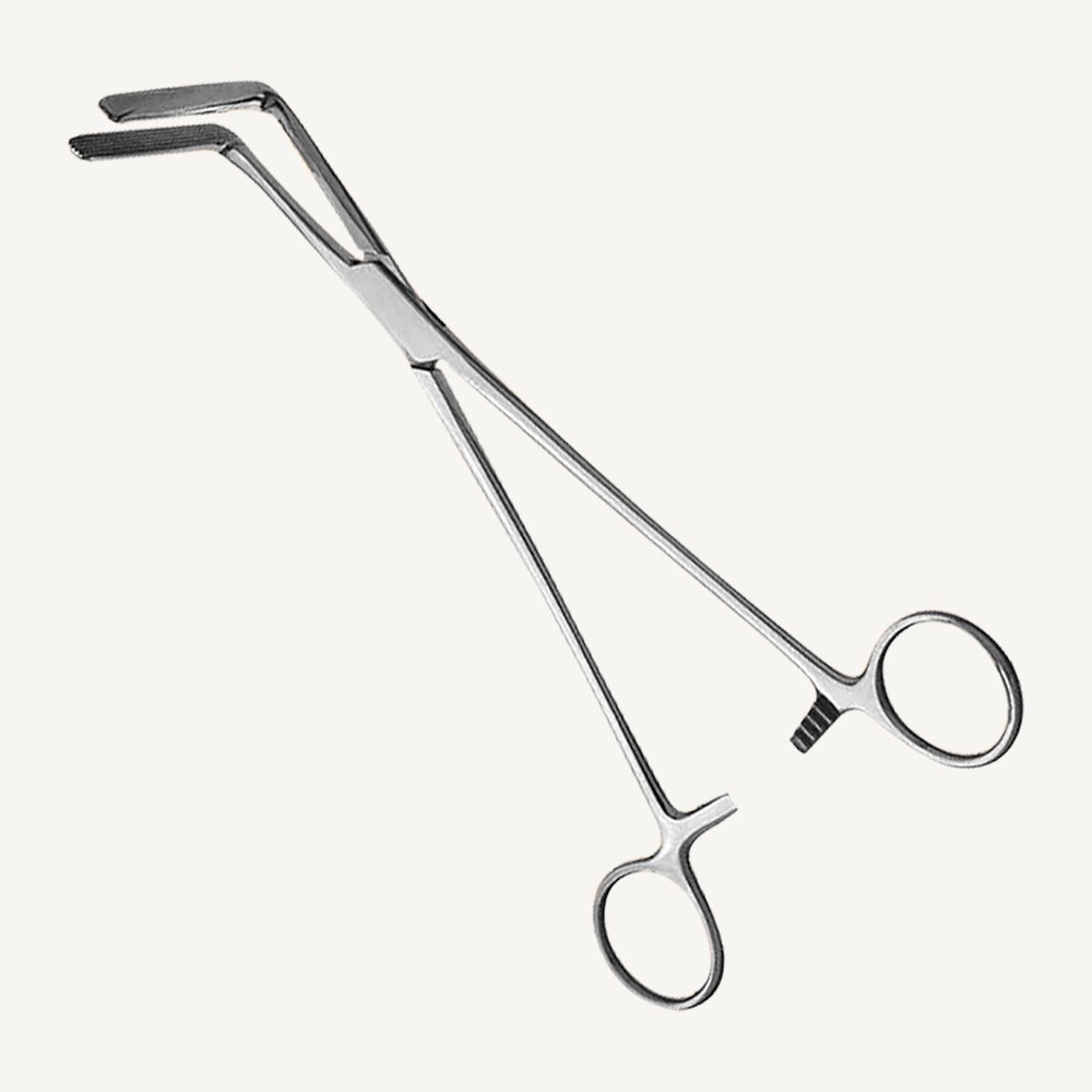 Wertheim Cullen Pedicle Forceps Size: Overall length 8-1/2 inches (21.6cm) Angled, Longitudinal Serrations.